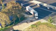 A police officer on a motorcycle was injured in a crash involving a semi truck on Archibald Avenue, just north of the 60 Freeway in Ontario on Tuesday, Oct. 8, 2013. (KABC Photo)
