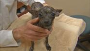 The dog named Daisy was discovered in a laundry basket last week in a Westminster park. Her vets say the Chihuahua was missing a hind leg, had been abused and was malnourished.