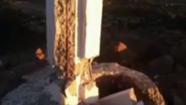 A still image from video shot by ABC7 viewer John Adamo shows the damaged base of a historic cross in Simi Valley. (KABC Photo / John Adamo)