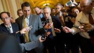Senate Majority Leader Sen. Harry Reid, D-Nev., is surrounded by reporters after leaving the office of Senate Minority Leader Sen. Mitch McConnell, R-Ken., on Capitol Hill on Monday, Oct. 14, 2013 in Washington. (AP Photo / Evan Vucci)