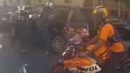 Parts of the incident were captured by a helmet-mounted video camera worn by one of the bikers. It shows the chase ending after the SUV exited the highway and got stuck in street traffic. One biker can be seen bashing in the driver's window with his helmet. Police say the group then pulled the man out of the SUV and beat him.