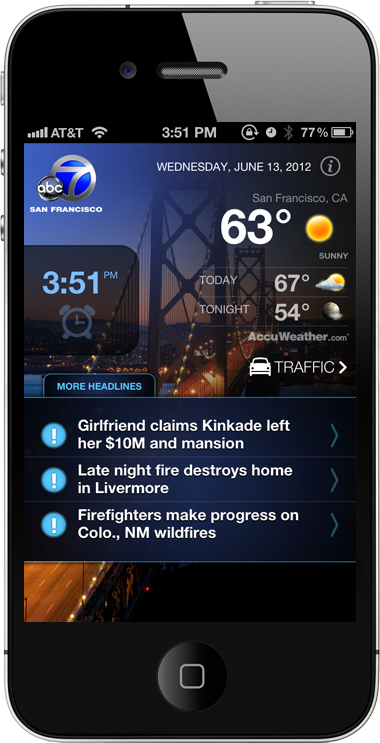 Wake up with the ABC7's Alarm Clock app! Start your day with local news headlines, live Mega Doppler HD radar, current weather conditions and traffic.