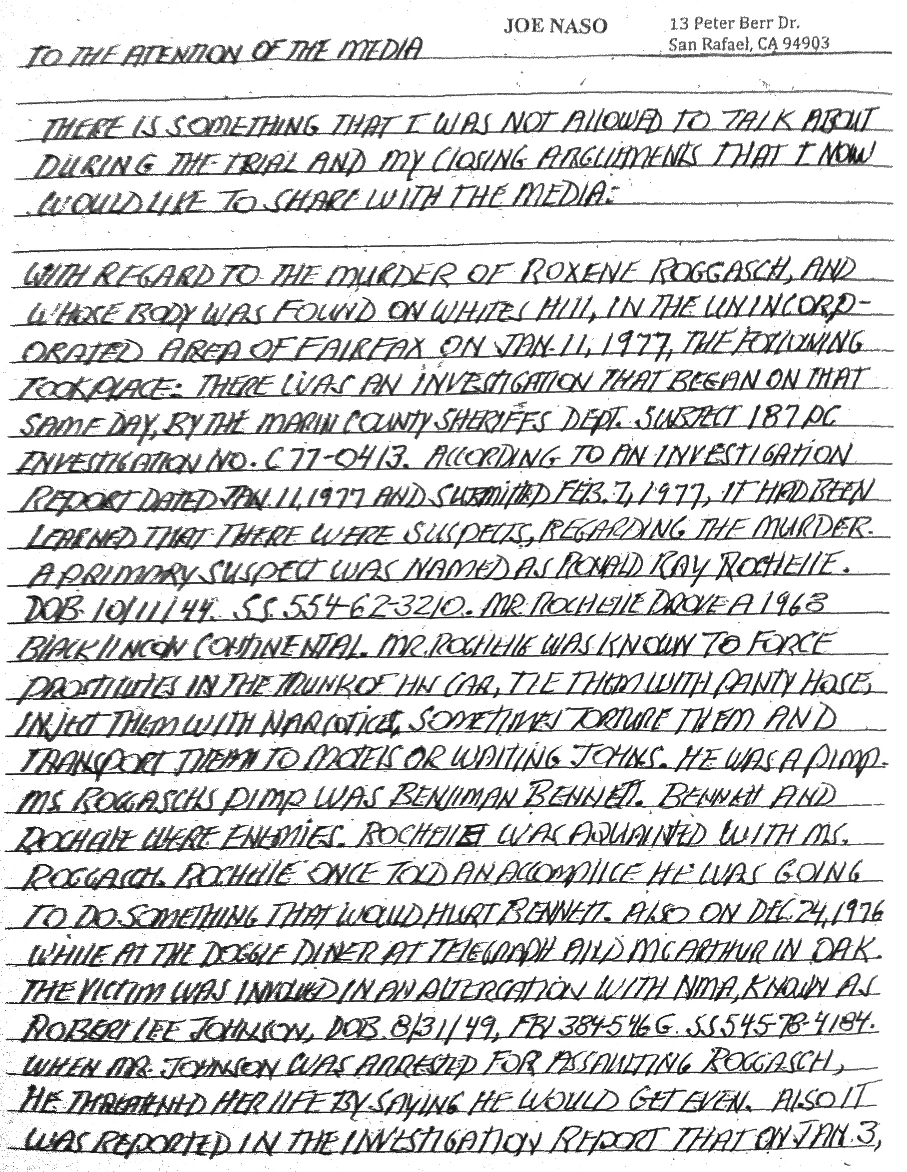 On Monday, August 19, 2013, Naso had a sealed letter hand-delivered to the I-Team, discussing other suspects in the death of Roxene Roggasch near Fairfax in Marin County, January 1977: