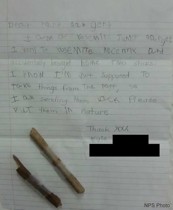 1 of 9: Evie, the Yosemite junior park ranger who sent an apology letter when she inadvertently took home two sticks, got the chance to return the sticks to the park over the weekend. ( Photo)