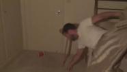 Beeler agrees to try it out so we set up the camera in his room. One moment you can see him in a deep sleep and then the alarm goes off. Sure enough, Clocky jumps off the table and Beeler stumbles out of bed.