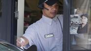 A Carl's Jr. employee gives a customer their order through a drive-thru window in San Diego on Friday, Sept. 13, 2013. (AP Photo/Sam Hodgson)
