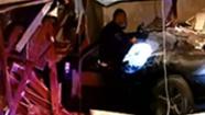 Officials say a car hit a curb at a high rate of speed, went airborne and then slammed into a house.