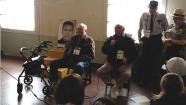 Former inmate Robert Luke, on the left with his mugshot behind him, compares his memories at Alcatraz with retired Correctional Officer George DeVincenzi during a presentation in the dining hall of the prison. (KGO Photo)