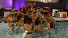 1 of 29: The first group date of the season features Brad and 15 excited, gorgeous women. Michelle is already annoyed that she has to share Brad with 14 other women on what will be her 30th birthday. Brad reveals that they will be filming PSAs to remind people about the importance of donating blood through the American Red Cross and encouraging the country to participate in January's National Blood Donor Month. However jealousy rears its ugly head when Brad kisses several of the ladies. In fact, Melissa annoys the others when she rudely interrupts the filming to steal a kiss with the handsome Bachelor. But when Brad shoots a particularly provocative scene with two sexy bachelorettes, Michelle loses her cool and storms out. The drama increases at a rooftop pool after-party, on "The Bachelor." (ABC/RICK ROWELL)