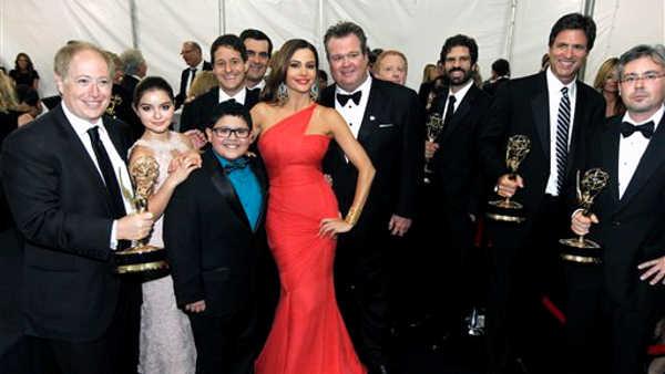 1 of 35: The cast and crew of "Modern Family" pose backstage after winning the award for outstanding comedy series at the 63rd Primetime Emmy Awards on Sunday, Sept. 18, 2011 in Los Angeles. (AP Photo/Matt Sayles)