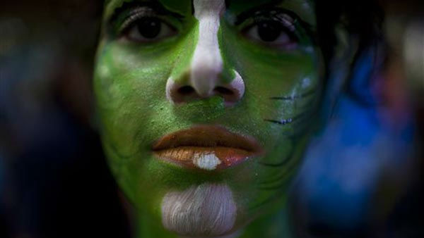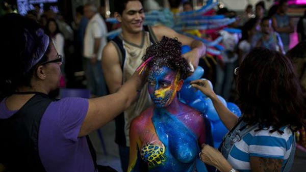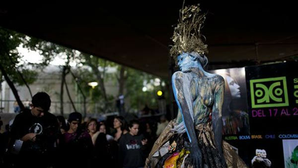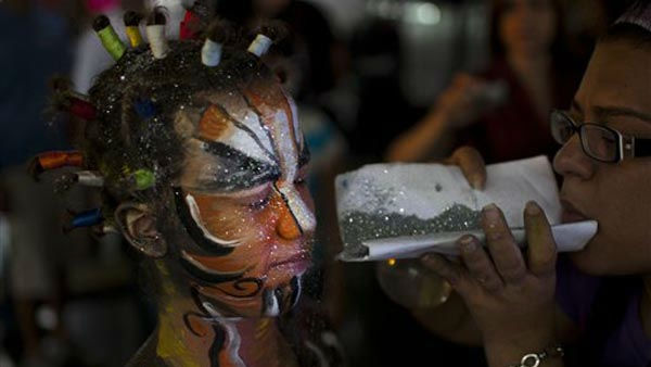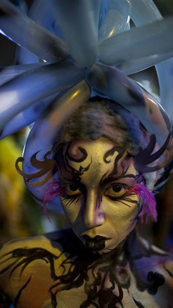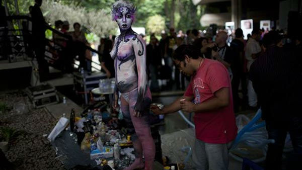 1 of 8: Artist Ana Echachy, from, Venezuela, right, blows glitter over a man face as the final touch of a body paint work during the VI World Meeting of Body Art at the Teresa Carreno's theater in Caracas, Venezuela, Saturday, Nov. 19, 2011. Activities such as body painting, tattooing, performances, workshops and conferences are part of the event. (AP Photo/Ariana Cubillos) (AP Photo/ Ariana Cubillos)