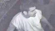 The suspect is described as a white or Hispanic male, between 25-35 years of age, of an average height and weight, with a distinctive tattoo on his right arm. At the time of the offense, the suspect wore a white cut-off T-shirt, red shorts, and is shown carrying an unidentified package in his right hand.
