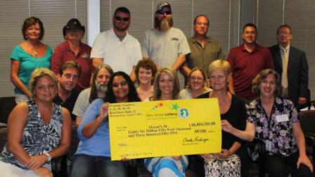 The nine women and seven men posed Monday at lottery headquarters with an oversized mock check made out to Ocean's 16, what the group of Ocean County employees dubbed themselves in a play on the "Ocean's Eleven" series of movies.