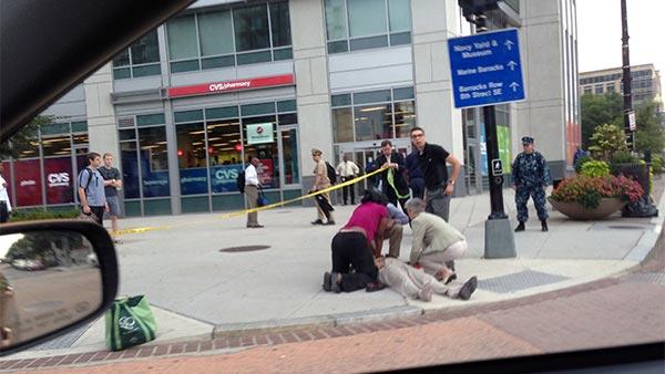 1 of 25: This photo, which AP obtained from Don Andres and has been authenticated based on details in it, shows emergency personnel attending to a scene where a gunman was reported at the Washington Navy Yard in Washington, on Monday, Sept. 16, 2013. At least one gunman opened fire inside a building at the Washington Navy Yard on Monday morning, and a Defense Department official said several people were killed and as many as 10 were wounded, including a law enforcement officer. (AP Photo/Don Andres)