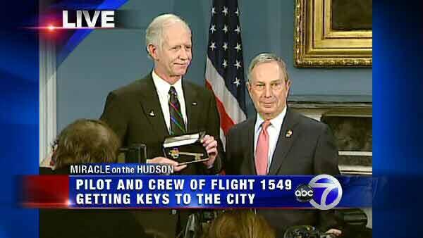 1 of 41: Mayor Bloomberg presented the crew from the 'Miracle on the Hudson' with keys to the city.