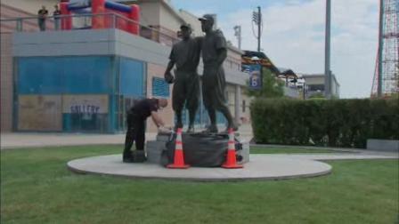On Wednesday, the words "Heil Hitler," an expletive and racist epithets were discovered scrawled on the statue in black marker. The statute of Jackie Robinson and a teammate stands outside Brooklyn's minor league baseball stadium.