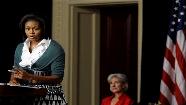First lady Michelle Obama speaks on health insurance reform and its impact on women and families, Friday, Sept. 18, 2009, in the Eisenhower Executive Office Building on the White House complex in Washington. Health and Human Services Secretary Kathleen Sebelius listens at right. (AP Photo / Haraz N. Ghanbari)