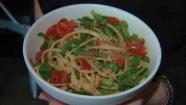 8 oz un-cooked linguine 8 stalks asparagus, cut into small pieces 1/2 cup cooked cherry tomatoes* 2 handfuls of arugula 1/4 cup white wine 1 garlic clove chopped pecorino cheese 1 tsp lemon zest 1 tsp ground fennel seed 1 tbl salt (for pasta water) a pinch of salt (for recipe) a pinch of pepper enough olive oil to coat the bottom of a skillet