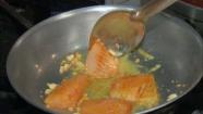 So when the restaurant can't get their hands on Bombay duck, they use tilapia for the Bombay fish curry. The dry marinade is made of turmeric, red chili powder and tamarind. The filets are then sautéed with garlic, then the curry comes in. There are two kinds of curry used - one made with garlic, green chilis and cilantro, and another that adds a tangy creaminess with tamarind and coconut milk.