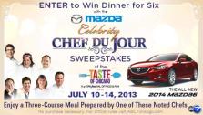 1. HOW IT WORKS: No Purchase Necessary. To enter, (a) Online - Go to www.abc7chicago.com and click on the ABC 7 and Mazda6 Celebrity Chef Du Jour icon and type in the information requested or (by) U.S. Mail In an envelope please the following information: Your First Name, Last Name, address to include city, state and postal code, day time phone number, and birth date. Mail your entry to ABC 7 and Mazda6 Celebrity Chef Du Jour, c/o WLS-TV, P.O. Box 64389, Chicago, Illinois 60664-0389. All entries must be postmarked and received by July 1, 2013. Limit one entry per person, mailing address or e-mail address (regardless of more than one person uses the same mailing or e-mail address.) Sponsor is not responsible for lost, late or misdirected mail or e-mail. All entries remain the property of sponsors and will not be acknowledged or returned. Five (5) five winners will be selected on or about date July 2, 2013.