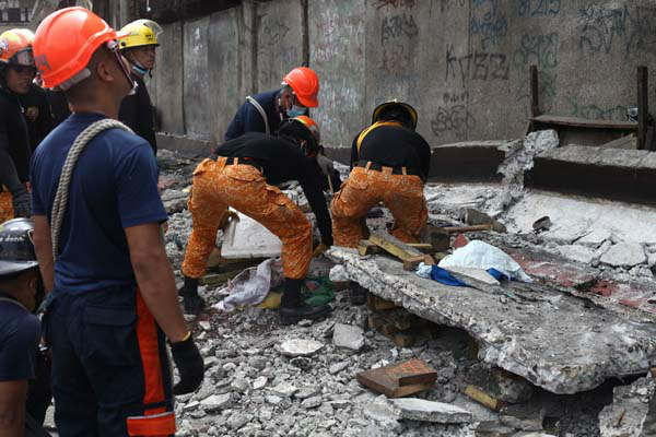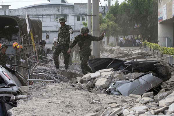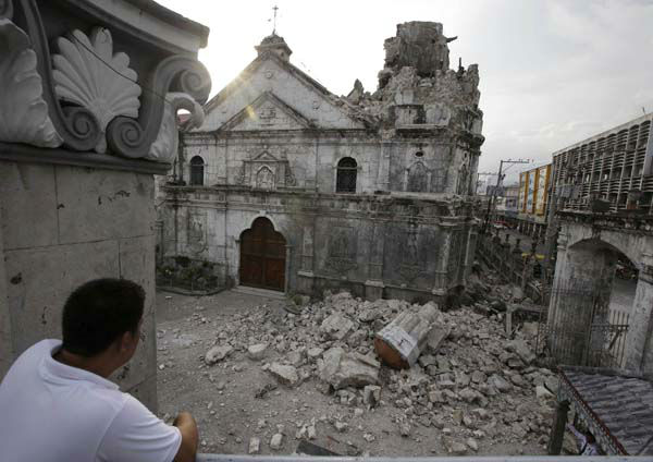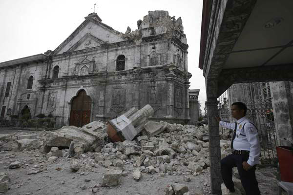 1 of 8: A private guard stands near the damaged Basilica of the Holy Child following a 7.2-magnitude earthquake that hit Cebu city in central Philippines and toppled the bell tower of the Philippines' oldest church Tuesday, Oct. 15, 2013. The tremor collapsed buildings, cracked roads and toppled the bell tower of the Philippines' oldest church Tuesday morning, causing multiple deaths across the central region and sending terrified residents into deadly stampedes. (AP Photo/Bullit Marquez) (AP Photo/ Bullit Marquez)