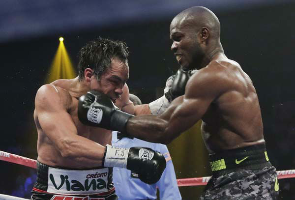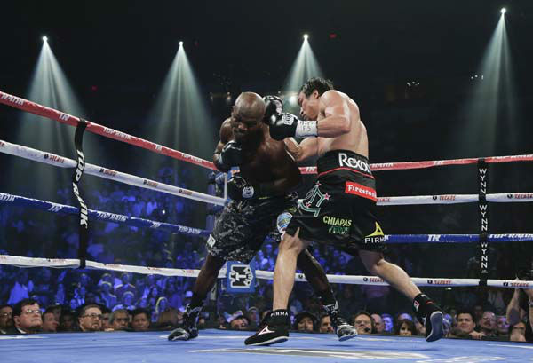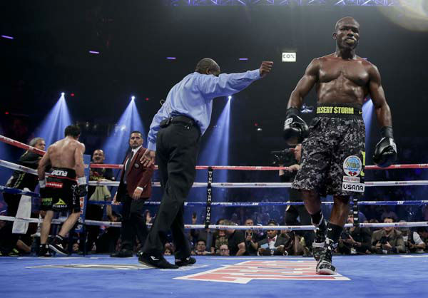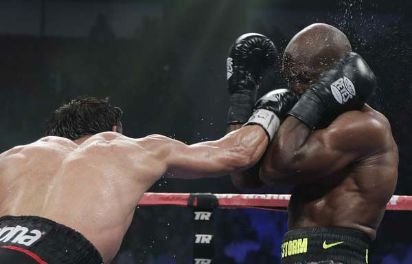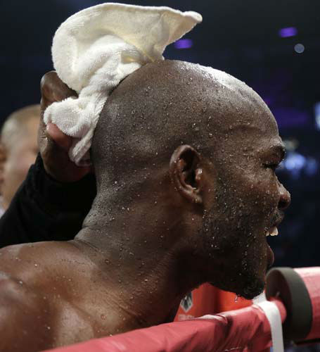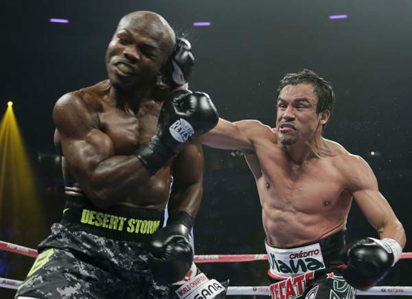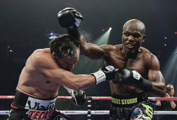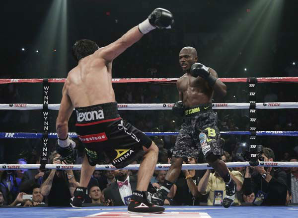 1 of 20: Timothy Bradley shouts to fans after defeating Juan Manuel Marquez by split decision during a WBO welterweight title fight, Saturday, Oct. 12, 2013, in Las Vegas. (AP Photo/Julie Jacobson) (AP Photo/ Julie Jacobson)