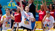 July 4, 2013 ( NEW YORK) -- Joey Chestnut downed 69 franks and devoured his own record in the men's Fourth of July hot dog eating contest while Sonya Thomas defended her title in the women's competition.