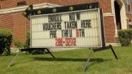 In this Aug. 12, 2011 photo, a sign encouraging students to enroll using school vouchers sits at Our Lady of Hungary Catholic School on the west side of South Bend, Ind. For the first time, Indiana is offering public tax dollars to help pay private school tuition for families that meet income guidelines. (AP Photo/Joe Raymond)