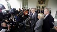 Senate Majority Leader Harry Reid of Nev., center, accompanied by, from left, Sen. Charles Schumer, D-N.Y., Senate Budget Committee Chair Sen. Patty Murray, D-Wash., and Senate Majority Whip Richard Durbin of Ill., speaks to members of the media outside the West Wing of the White House in Washington, Thursday, Oct. 10, 2013, following a meeting with President Barack Obama. (AP Photo/Pablo Martinez Monsivais)