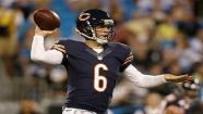 Chicago Bears quarterback Jay Cutler (6) looks to pass against the Carolina Panthers during the first half of a preseason NFL football game in Charlotte, N.C., Friday, Aug. 9, 2013. (AP Photo/Bob Leverone)
