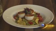 That means a lot more flavor and color. Take the cherry heirlooms, for example. Dwyer sautees them with zucchini and homemade spinach fettucine, then serves them topped with seared sea scallops and micro greens.
