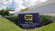 A Best Buy store displays a sign as it prepares for the back-to-school sales tax holiday in Hialeah, Fla., Thursday, Aug. 1, 2013. (AP Photo/Alan Diaz)
