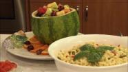 She garnished a macaroni salad, again, mayo-free with some bright green basil leaves. And more of those leaves went into a fresh pesto featuring olive oil and pine nuts. It makes up in your food processor in seconds. The chef brushed that on shrimp she pre-grilled.