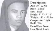 The suspect is described as a black male, 19 to 22 years old, standing 5'7" to 5'10" tall and weighing 150 to 170 pounds. He was wearing a black or dark gray hooded sweatshirt and dark-colored jeans.