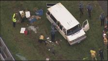 The van overturned and ended up in the grassy median separating the north- and southbound sides of the interstate.