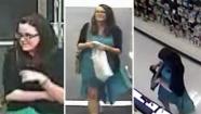 The suspect is a white female, approximately early to mid-20's, with long dark hair. She was last seen wearing glasses, a green dress, black sweater, and carrying a large tan handbag.