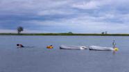 Long-distance swimmer Jim Dreyer takes off from the Clinton River Boat Club in Clay Township, Mich., Monday, Aug. 5, 2013 to swim 22 miles across Lake St. Clair while hauling dinghies filled with 2,000 pounds of bricks. Dreyer has made direct crossings of each of the five Great Lakes. The event is to raise funds and awareness for Habitat for Humanity. The swim is expected to take 30 hours and end Tuesday at Detroit's Belle Isle. (AP Photo/Carlos Osorio)