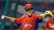 Philadelphia Phillies second baseman Chase Utley throws during batting practice before a baseball game against the Miami Marlins in Miami, Monday, May 20, 2013. (AP Photo/Lynne Sladky)