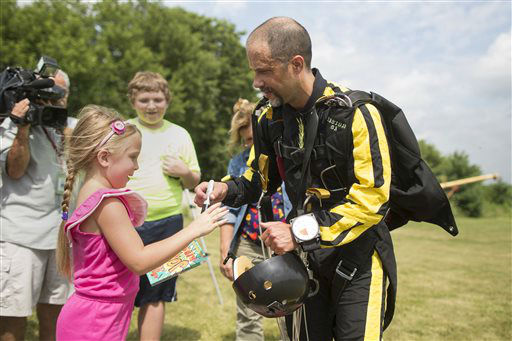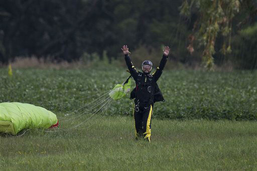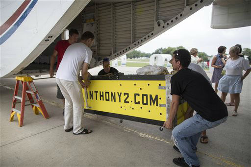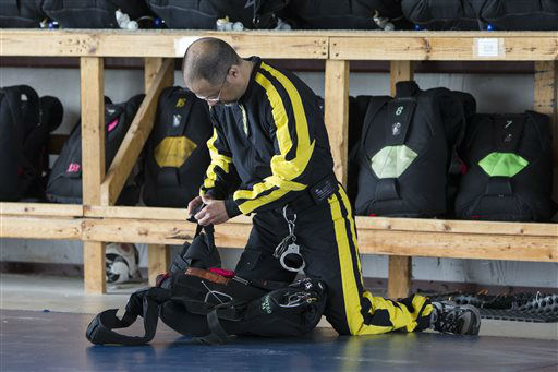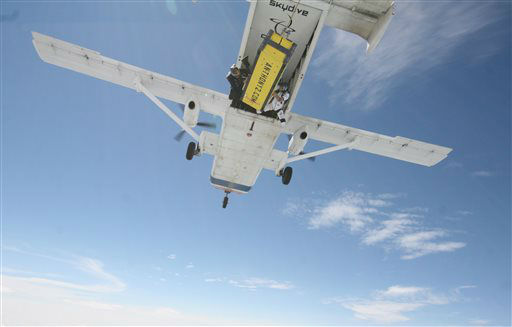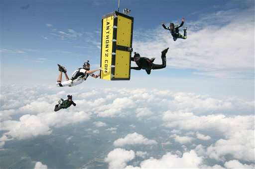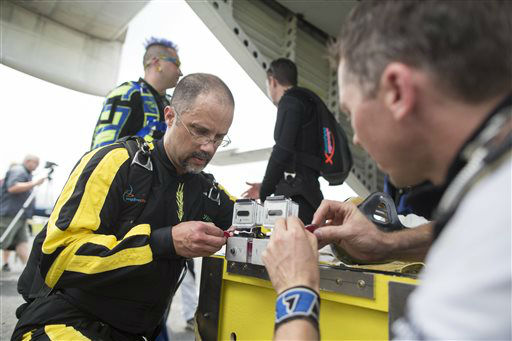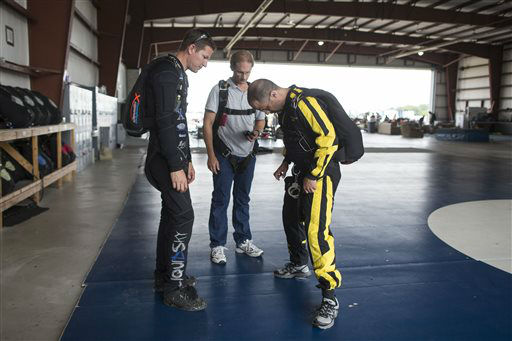 1 of 13: Sky Dive Chicago owner, Rook Nelson, left, Jeff Hansen, and Escape artist Anthony Martin check their equipment before Anthony Martin attempts to escape from a box he will be handcuffed and locked inside and dropped from an airplane in Ottawa, Ill., Tuesday, Aug. 6, 2013. Martin, of Sheboygan, Wis., is no stranger to extracting himself from tricky situations. Since his first escape from handcuffs at the age of 10, he has wriggled his way out of straitjackets, ropes, chains, jail cells, coffins and a cage submerged under water. (AP Photo/ Scott Eisen)